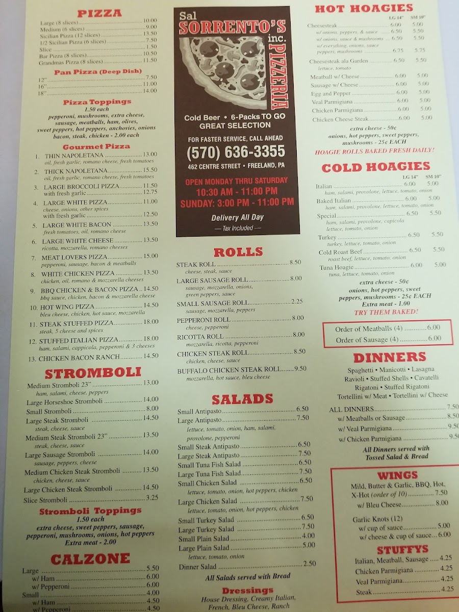 The menu at Sal Sorrento's Pizzeria offers a thoughtful selection of classic and hearty Italian-American fare, blending casual comfort with familiar flavors. Whether you're stopping by for a quick slice, settling in with friends over beer, or ordering in for a relaxed dinner at home, the options feel welcoming and straightforward.